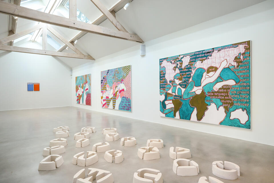 Dans son œuvre sculpturale Matrice constituée de moules de lettres de l’alphabet, les corps sont amenés à circuler dans un espace à la fois physique et symbolique. Dans l’espace morcelé de Land & Language, l’intégration de mots entre et dans les corps transforme la toile en un territoire mental dense et complexe. Les mots sont comme extraits de la chair et redeviennent conceptuels. Ils traversent et brouillent les frontières. « La migration pose la question des corps et du langage, explique l’artiste. Quand on se déplace, on transporte aussi sa langue. Les corps deviennent les limites politiques et symboliques de la langue ». C’est ainsi que se trouve posée la question de l’identité et de la culture. Qu’emporte-t-on avec soi lors d’un exil ? Que reste-t-il de notre identité passée ? Comment « migrons »-nous d’une langue à une autre, d’une culture à une autre ? Quelles peuvent être les limites à ces mouvements ? Dans le dernier tableau, les océans ont envahi la géographie de la toile et les mots de la langue forment une seule cartographie possible. Une petite Prédelle vient ponctuer l’ensemble : il s’agit du mot BORDER qui se déploie sur deux formats, changeant de couleur quand on passe d’une syllabe à l’autre.